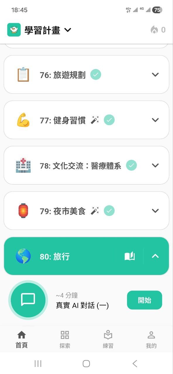 • 如果覺得每次都要自己選情境很麻煩,或是不知道要跟ai聊什麼,可以選擇「學習計劃」,他會根據之前跟你聊過的內容,自動增加你可能有興趣的情境課程